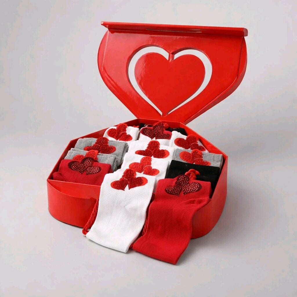 Das Bild zeigt eine dekorative Geschenkbox mit mehreren Paar Socken, die ordentlich in Fächern angeordnet sind. Die Box ist rot und hat ein großes, herzförmiges Sichtfenster im Deckel, was stark an ein Liebesgeschenk erinnert. ❤️